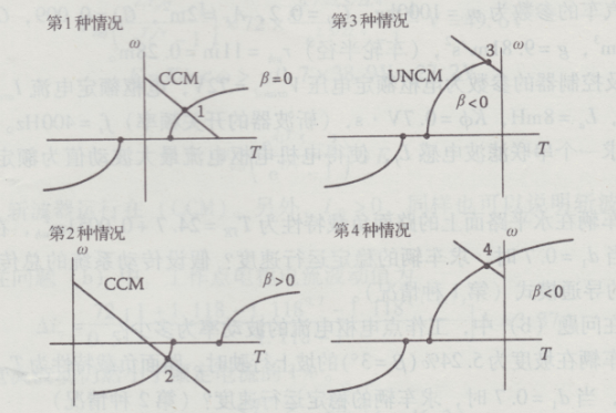 電動(dòng)車系統(tǒng)的穩(wěn)態(tài)工作點(diǎn)分析,工作點(diǎn)即電機(jī)轉(zhuǎn)矩一角速度特性曲線與路面負(fù)載特性曲線的交點(diǎn)。這里選取了電機(jī)轉(zhuǎn)矩-角速度平面上3個(gè)象限中的4個(gè)工作點(diǎn),分別代表了4種斬波器運(yùn)行模式,它們是象限內(nèi)加速CCM(第1種情況),第四象限內(nèi)加速CCM(第2種情況)。
