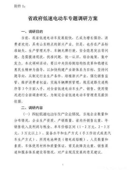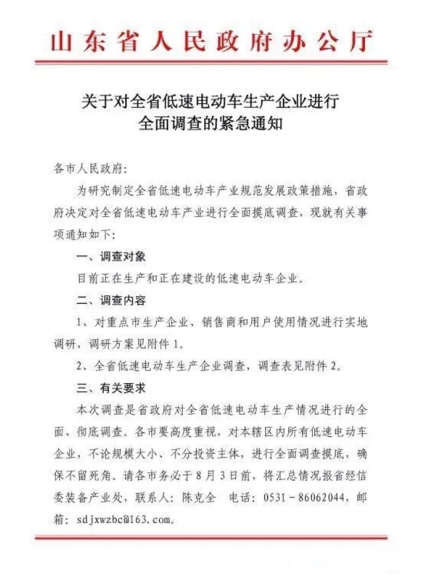 為了規(guī)范低速電動車產(chǎn)業(yè),制定產(chǎn)業(yè)政策,山東省政府決定對全省低速電動車進(jìn)行摸底調(diào)查,于7月27日發(fā)布了《關(guān)于對全省低速電動車生產(chǎn)企業(yè)進(jìn)行全面調(diào)查的緊急通知》,對山東省內(nèi)的生產(chǎn)企業(yè)不論規(guī)模大小及投資主體,進(jìn)行全面的摸底調(diào)查。