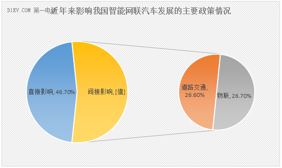 參考2010年~2016年8月的智能網(wǎng)聯(lián)汽車相關(guān)政策情況,對智能網(wǎng)聯(lián)汽車產(chǎn)生直接影響的政策數(shù)量達46.7%,主要涉及汽車及汽車零部件;間接性影響的政策數(shù)量則為53.3%,主要涉及汽車道路交通、物聯(lián)網(wǎng)等,暫未過多涉及通信等領(lǐng)域。