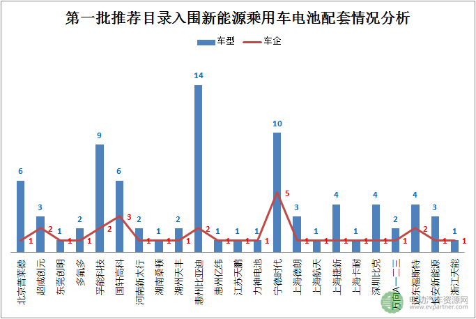 據(jù)電動(dòng)汽車(chē)資源網(wǎng)統(tǒng)計(jì),進(jìn)入本批推薦目錄的73款新能源乘用車(chē)由23家動(dòng)力電池企業(yè)提供配套,分別為:北京普萊德、超威創(chuàng)元、東莞創(chuàng)明、多氟多、孚能科技、國(guó)軒高科、河南新太行、湖南桑頓、湖州天豐、惠州比亞迪、惠州億緯、江蘇天鵬、力神電池、寧德時(shí)代、上海德朗、上海航天、上海捷新、上海卡耐、深圳比克、萬(wàn)向A一二三、遠(yuǎn)東福斯特、長(zhǎng)安新能源、浙江天能。