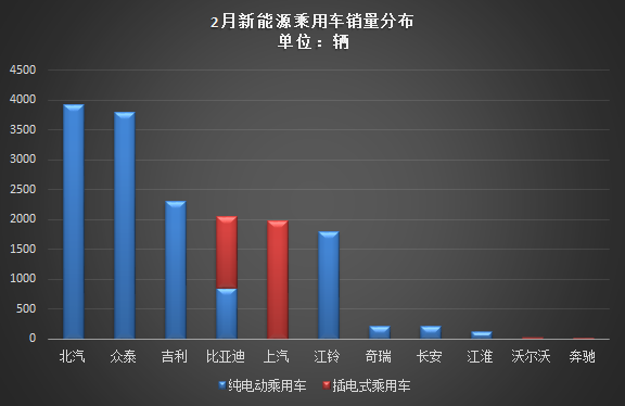分車企看,崔東樹分析道,2月新能源乘用車銷量貢獻(xiàn)較大的車企主要集中在北汽、眾泰、吉利、比亞迪、上汽等主流車企,其中北汽依靠EU系列、EC系列車型,當(dāng)月銷量超過4000輛,眾泰依靠云100、E200等主力車型貢獻(xiàn)3000多輛;吉利、上汽、比亞迪銷量則均超過2000輛。此外,2月銷量中包括江鈴E200等A00級(jí)車型貢獻(xiàn)也很大,占比也有所提升。