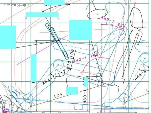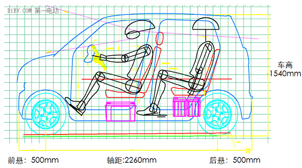 根據(jù)現(xiàn)有標(biāo)準(zhǔn)草案來(lái)看,低速電動(dòng)車的尺寸,長(zhǎng)<3.3米,寬<1.5米。我們以一款常見的4門4座位的低速電動(dòng)車車型為例,其人體布置簡(jiǎn)圖如下圖所示。