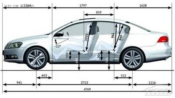 為方便分析,我們將之與一款常見的三廂轎車帕薩特的尺寸進(jìn)行對(duì)比,該車型的外形尺寸為4769×1820×1472mm。其余尺寸如下圖: