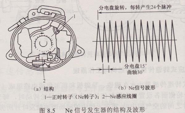 電磁感應(yīng)式轉(zhuǎn)速傳感器的工作原理如圖8.4所示。磁鐵的磁感應(yīng)線經(jīng)轉(zhuǎn)子、信號(hào)線圈、托架構(gòu)成回路。轉(zhuǎn)子由輸出軸帶動(dòng)旋轉(zhuǎn),利用凸齒和托架之間的間隙變化,使通過(guò)信號(hào)線圈的磁通量發(fā)生變化,從而使線圈中產(chǎn)生感應(yīng)電壓來(lái)產(chǎn)生檢測(cè)信號(hào)。由圖8.4(b)可見(jiàn),當(dāng)轉(zhuǎn)子的凸齒轉(zhuǎn)到A位置時(shí),信號(hào)線圈中通過(guò)大的磁通量,但其變化率為零,因而感應(yīng)電壓為零。當(dāng)轉(zhuǎn)至C位置時(shí),信號(hào)線圈中磁通量的變化率達(dá)到大,信號(hào)線圈中產(chǎn)生負(fù)方向的大感應(yīng)電壓。如此反復(fù),信號(hào)線圈上就產(chǎn)生交變電壓信號(hào)。現(xiàn)以Ne轉(zhuǎn)子上有24個(gè)齒為例,Ne信號(hào)發(fā)生器的結(jié)構(gòu)及波形如圖8.5所示。在Ne信號(hào)線圈中產(chǎn)生出與凸起齒數(shù)相等的脈沖電壓信號(hào)。將這些脈沖電壓信號(hào)輸入電動(dòng)機(jī)ECU,通過(guò)計(jì)算單位時(shí)間內(nèi)脈沖電壓的數(shù)目,即可確定電動(dòng)機(jī)的轉(zhuǎn)速。