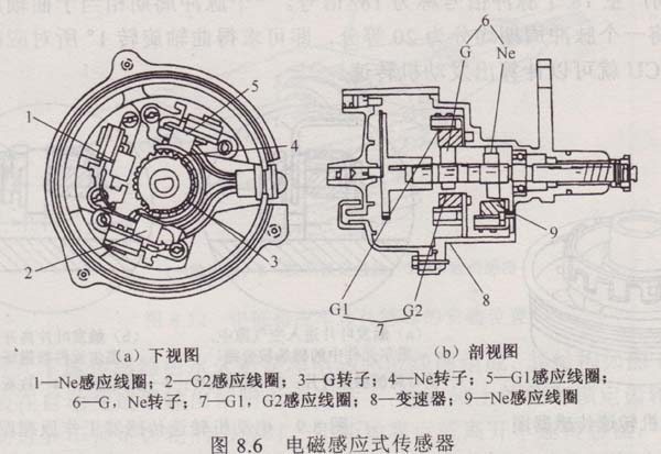 實(shí)際安裝在變速箱內(nèi)的電磁感應(yīng)式傳感器結(jié)構(gòu)如圖8.6所示,主要由磁鐵、信號(hào)線圈和轉(zhuǎn)子等組成。G轉(zhuǎn)子和Ne轉(zhuǎn)子固定在變速器輸出軸上,與輸出軸同步轉(zhuǎn)動(dòng),信號(hào)線圈固定在變速器殼體上。